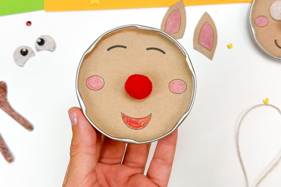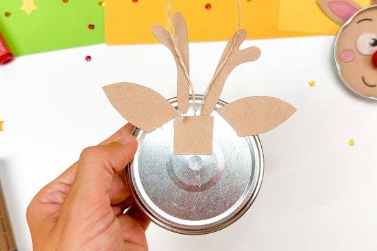 3. Helyezzük a rénszarvas arcát egy befőttesüveg fedelébe, majd a piros orrot is helyezzük rá.