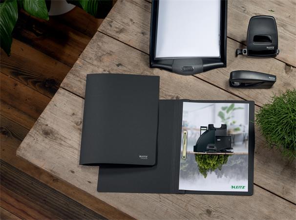 Attraktív, prémium minőségű gyorslefűző mappa, praktikus gyorsfűző szerkezettel, lyukasztott dokumentumok számára.