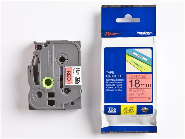 Feliratozógép szalag, 18 mm x 8 m, BROTHER, "TZe-441" piros-fekete
