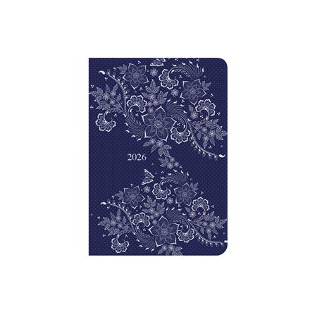 Színes grafikával díszített, matt fóliával bevont, fehér tömbös heti naptár, jelzőszalaggal.