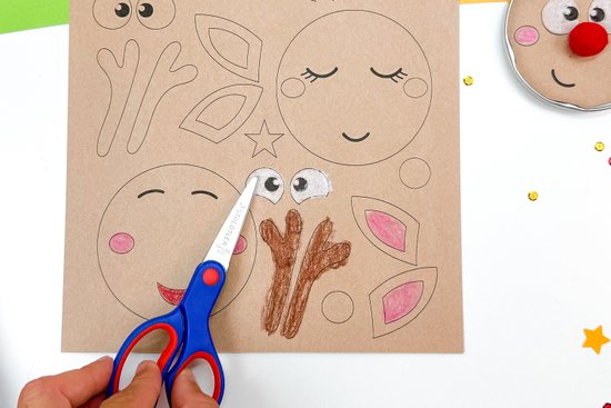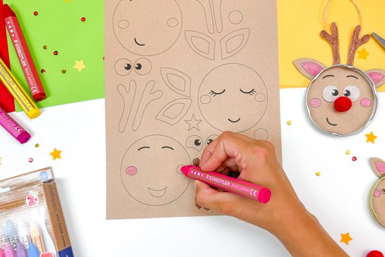 1. Nyomtassuk ki a sablont 160 g-os kartonpapírra, és színezzük ki az agancsot, az arcot, a szemeket és a füleket. A sablon innen tölthető le.
