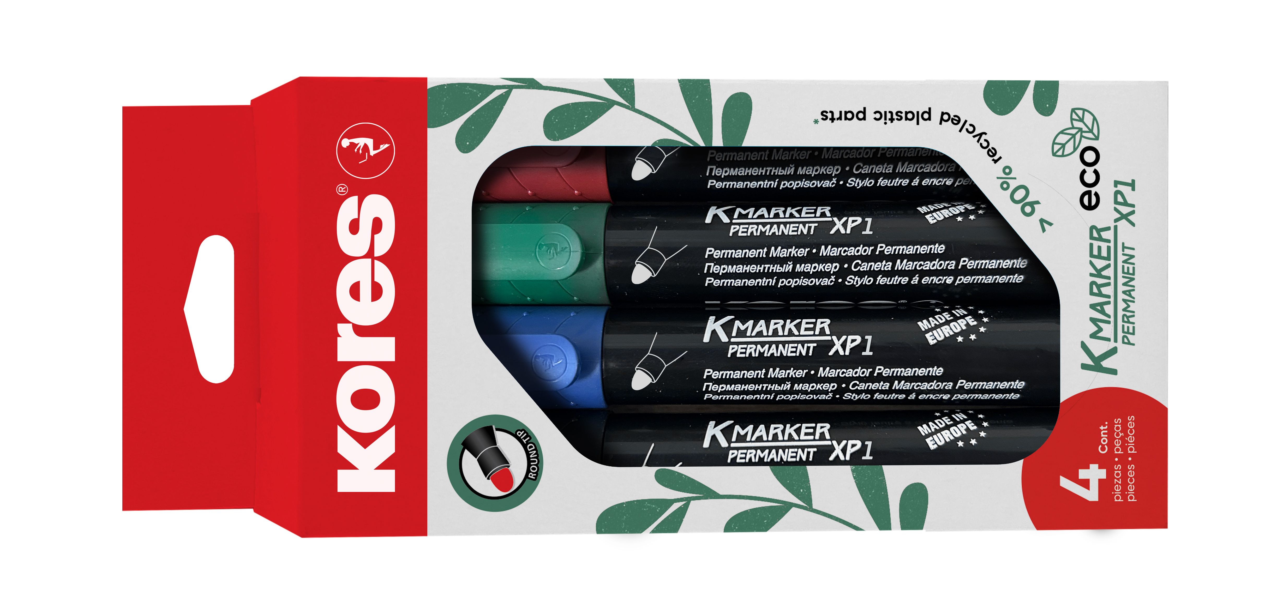 KORES „Eco K-Marker” család sokoldalú alkoholos, valamint tábla- és flipchart markerei könnyű és kényelmes írást biztosítanak. A markerek két fajta, vágott és kúpos hegykialakításban is elérhetőek. A kúposak vonalvastagsága 3 milliméter, míg a vágotté 1-3 milliméter. Szinte minden felületen, mint például a fémen, fán, papíron, műanyagon, vagy akár üvegen is használható. A 90 %-ban újrahasznosított műanyagból készült markerek vízálló, gyorsan száradó tintája akár 10 napig sem szárad be kupak nélkül.