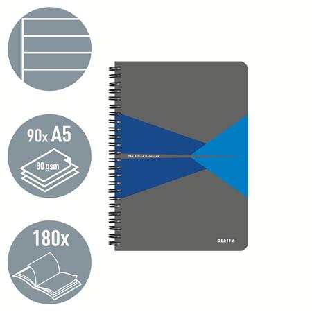 Spirálfüzet, A5, vonalas, 90 lap, laminált karton borító, LEITZ "Office", szürke-kék