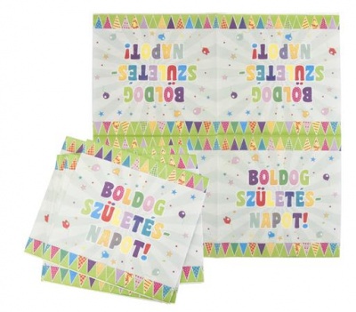 KezdőlapÜzemeltetésAjándékok és party kellékekParty kellékekSzalvéta, 33x33 cm, "Boldog Születésnapot", zászló minta